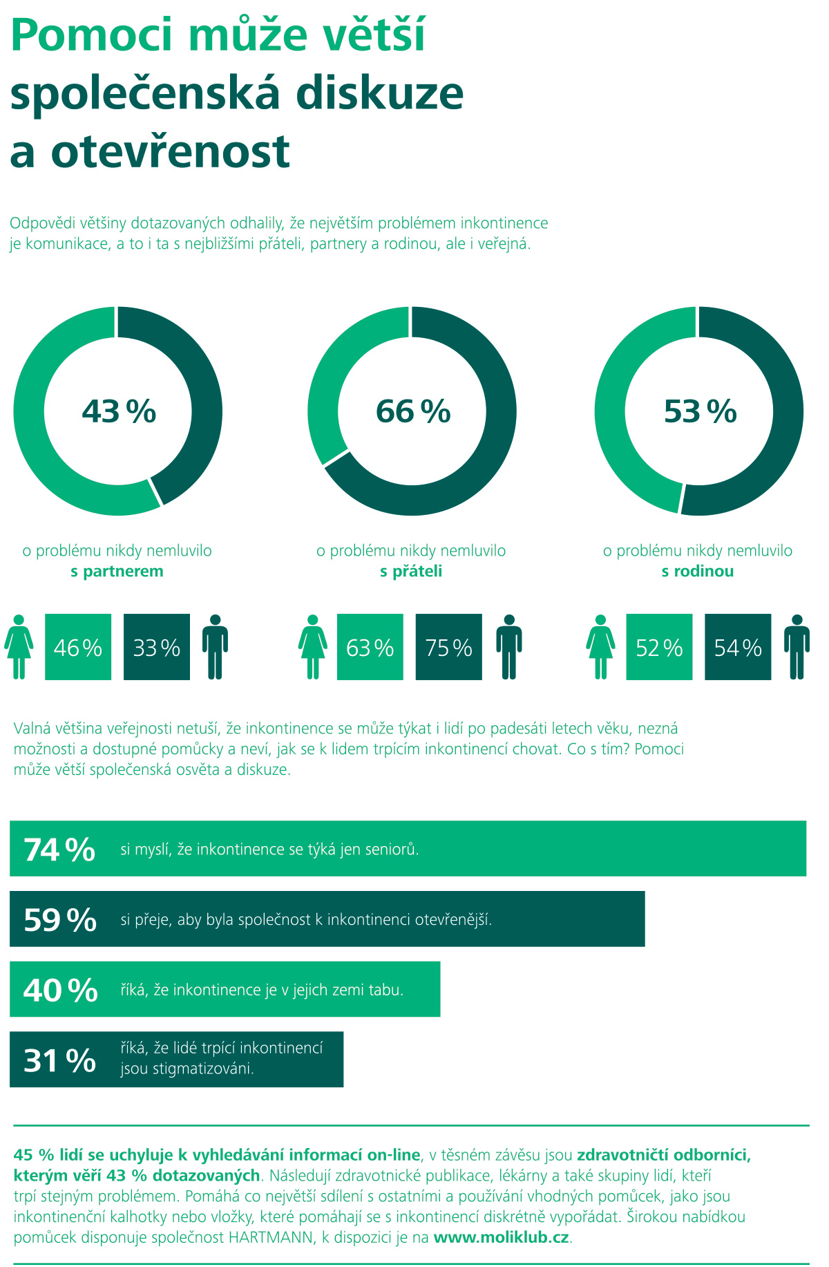 Na druhou stranu z výzkumu vyplývá, že většina z nich volá po větší vzdělanosti a informovanosti veřejnosti a věří, že inkontinence tabu být nemusí. „Jsme jedním z hlavních výrobců inkontinenčních pomůcek na světě. Proto je pro nás opravdu velmi důležité znát postoje lidí, kteří inkontinenci musí čelit. Podle toho se následně snažíme o výrobkové inovace,“ upozorňuje Andrea Pisingerová z HARTMANN - RICO.