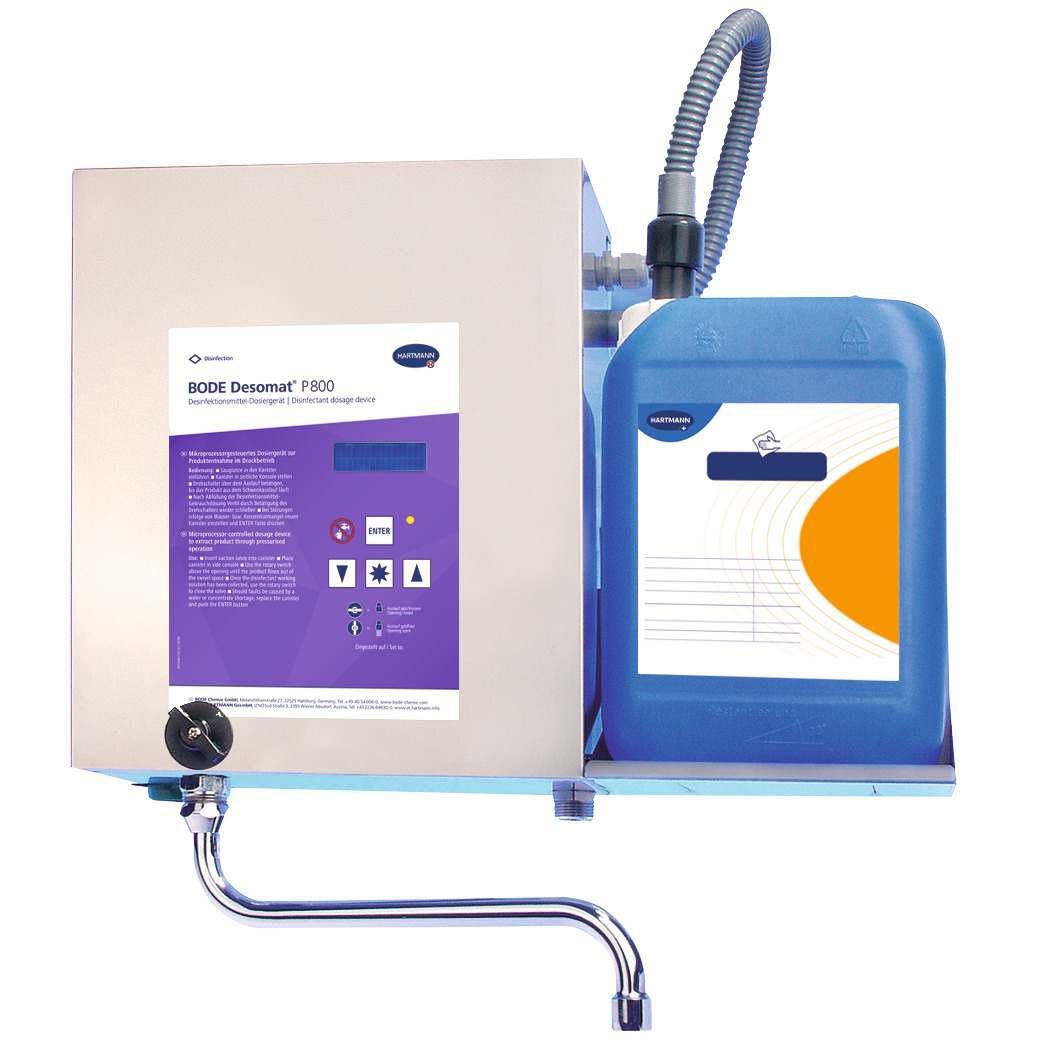 Die Dosiergeräte der BODE Desomat 800-Serie ermöglichen die genaue und sichere Entnahme gebrauchsfertiger Desinfektionsmittel in praxisorientierten Anwendungskonzentrationen. Die mikroprozessorgesteuerte funktionssichere Technik stellt die kontinuierliche Abgabe der voreingestellten Dosiering sicher.