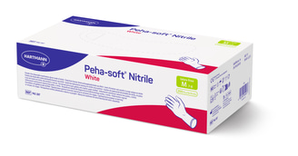 Der latexfreie Untersuchungs- und Schutzhandschuh aus weißem, synthetischem Nitrilkautschuk.