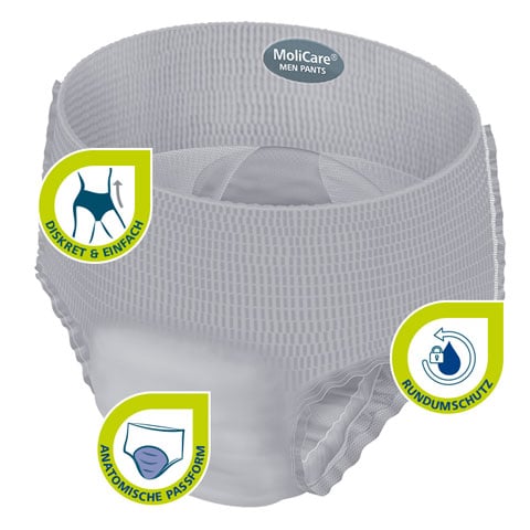 Speziell für Männer mit mittlerer Blasenschwäche geformte Pants bieten sicheren Schutz und halten die Haut gesund.