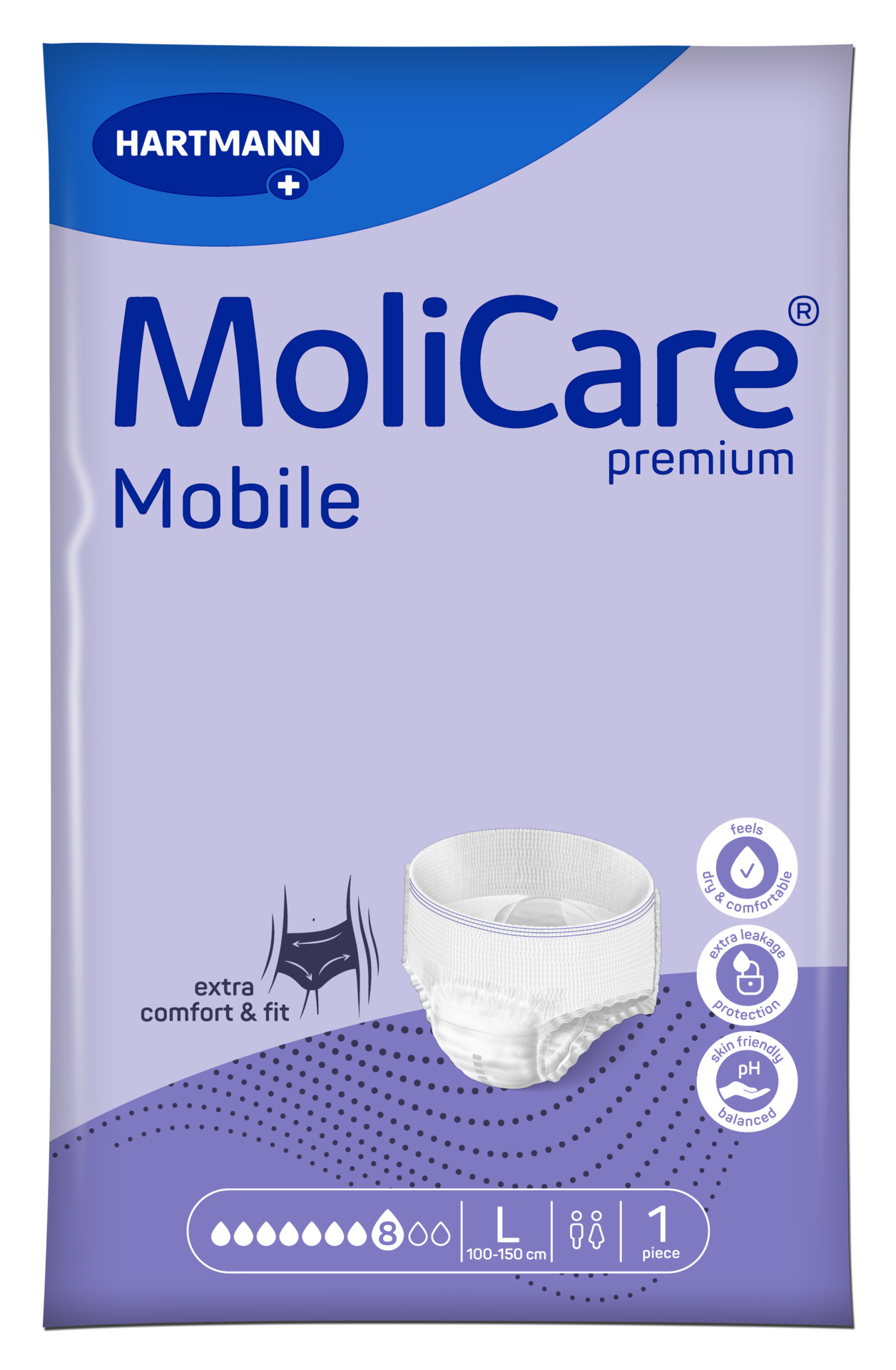 Τα MoliCare® premium Mobile 8 σταγόνων εσώρουχα ακράτειας ενηλίκων προσφέρουν ασφαλή, άνετη εφαρμογή και αξιόπιστη επιπλέον προστασία έναντι της ακράτειας. Ο μοναδικός απορροφητικός πυρήνας διατηρεί το δέρμα στεγνό και βοηθά στην πρόληψη ερεθισμών στην ευαίσθητη περιοχή.
