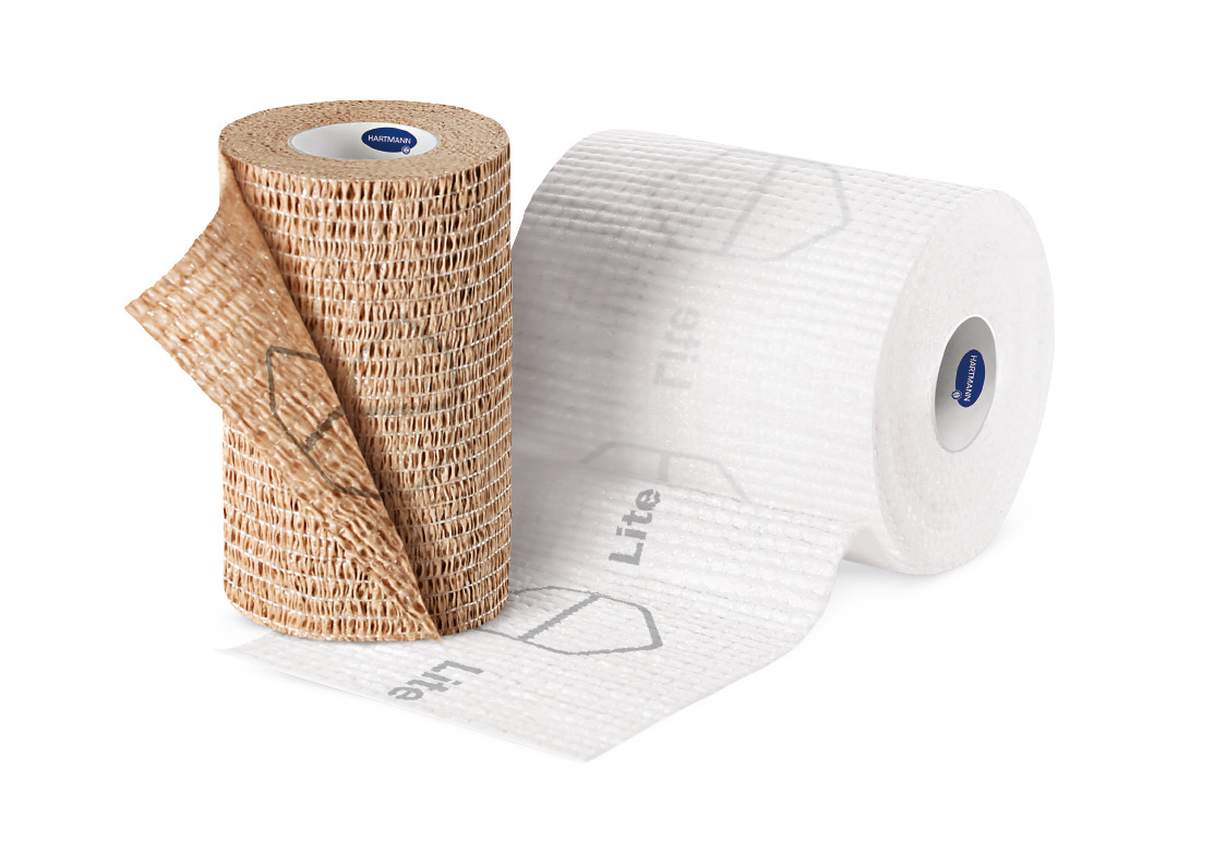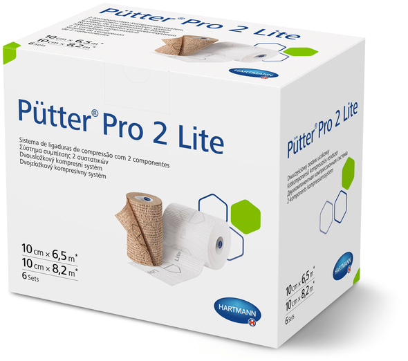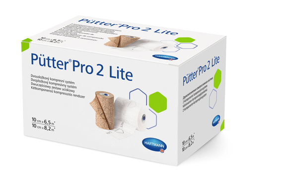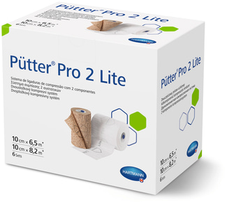 The PütterPro 2 Lite 2-component compression system is a combination of two non-woven bandages. One of the bandages is made of polypropylene and elastane and is brown in colour, the other one is made of polyester and elastane and is white in colour. The brown one has a cohesive layer on both sides, the white one has a cohesive layer on one side. The non-active and non-sterile devices are available as a kit. Both bandages are 10 cm in width. PütterPro 2 Lite contains indicator prints on both layers.