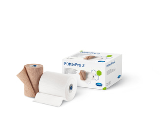 The PütterPro 2 Lite 2-component compression system is a combination of two non-woven bandages. One of the bandages is made of polypropylene and elastane and is brown in colour, the other one is made of polyester and elastane and is white in colour. The brown one has a cohesive layer on both sides, the white one has a cohesive layer on one side. The non-active and non-sterile devices are available as a kit. Both bandages are 10 cm in width. PütterPro 2 Lite contains indicator prints on both layers.