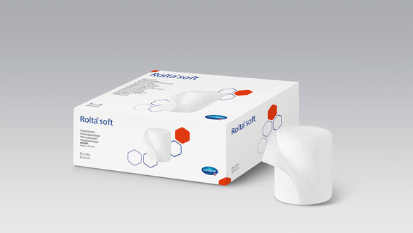 Synthetic padding bandage made of crinkled polyester threads, skin friendly, breathable and temperature balancing, wrinkle free application due to non-slip properties, easy to apply, can by torn appart by hand, may be sterilized (by autoclaving at 121 °C).