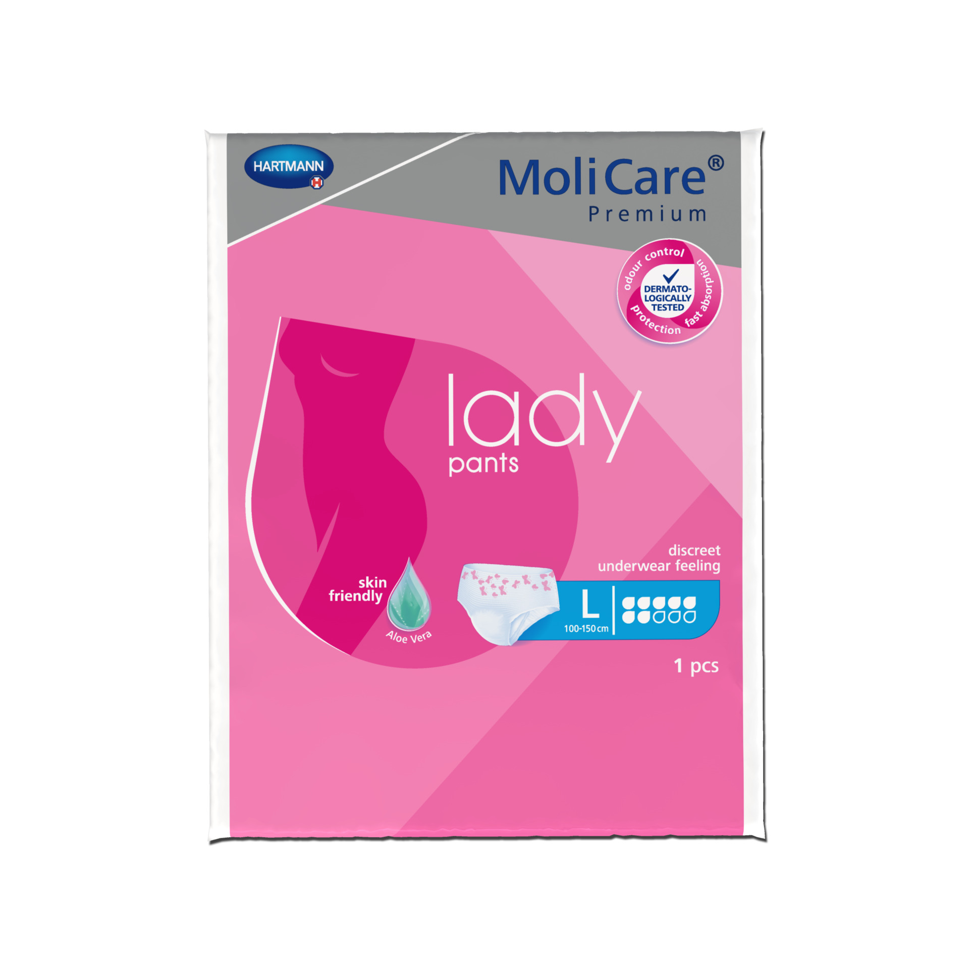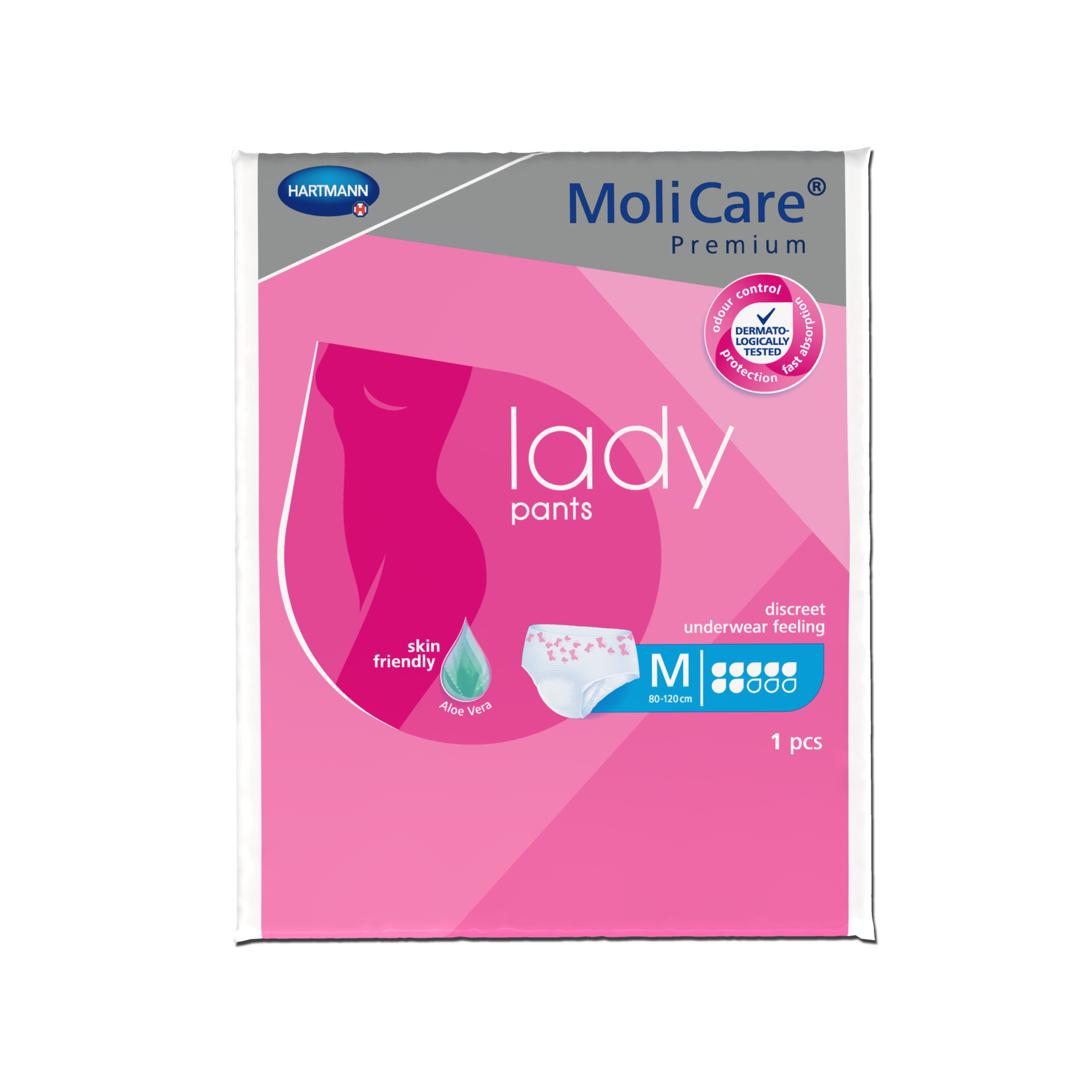 MoliCare Premium lady pants look and feel like regular underwear and are ideal for light to moderate levels of bladder weakness. The pants contain skin friendly Aloe Vera as well as a 3-layer absorbent core that pulls fluid away from the surface, so the skin stays dry, healthy and free from odours. It also has advanced technology that helps to maintain the skin's natural pH level and is important in reducing infection and skin irritation caused by incontinence.