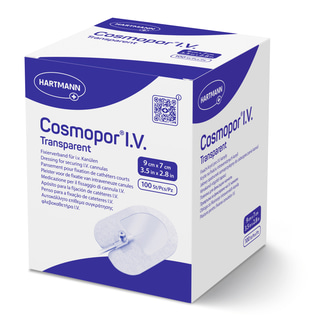 The main function of Cosmopor I.V. transparent is the sterile and mechanical covering and fixation of cannulae/catheters. Cosmopor I.V. transparent allows visual control of the puncture site without dressing change thanks to the transparent film window. The waterproof characteristics of the film provide a barrier against water, bacterial penetration and external contaminants. The dressing facilitates the free passage of water vapour and gases, allowing the skin to breathe. The rounded corners prevent it from rolling up, while the high degree of adhesiveness and the included fixation strips allow the dressing to remain firmly in place during the wear time. The dressing conforms to body contours. Medical assessment of the puncture site and surrounding skin is needed to determine when the dressing needs to be changed