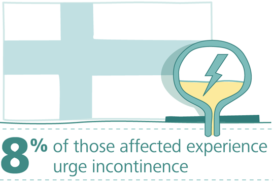 Urinary incontinence can cause various side effects that are perceived as disturbing or stressful. The most widespread among sufferers in Finland is urge incontinence - almost eight percent of those affected with incontinence are surprised by the urge to urinate and either do not make it to the toilet or only just make it.