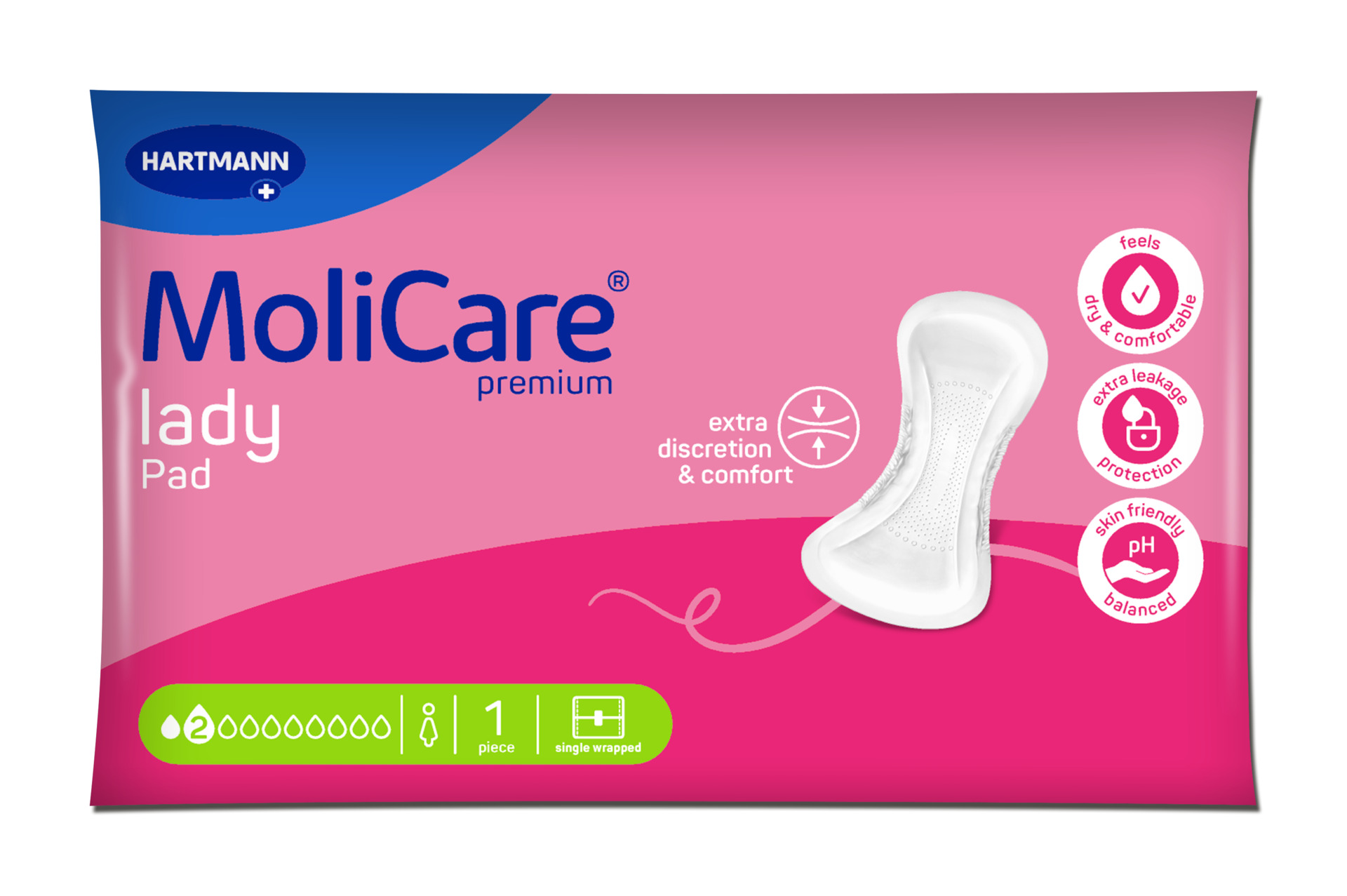 MoliCare® premium lady Pad 2 drops are incontinence pads for women with light bladder weakness. The patented absorbent core neutralises odours and helps maintain skin health.