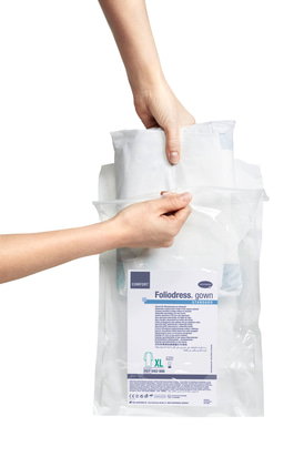 Single-use surgical gowns are made of multilayer non-woven fabric. The main garment material of the gowns acts as a barrier for germs and fluids whereas air and water vapour can pass. The gowns are alcohol-repellent, reliable, and low linting. They have ultra-sonic welded seams which serve to be water-repellent, waist ties, elastic knit cuffs, and raglan sleeves for additional freedom of movement. Gowns of the Comfort range are longer than Foliodress® gown Protect at the same size and therefore cover more surface area. They are available with wrapping or as a peel & go version without wrapping.