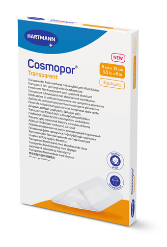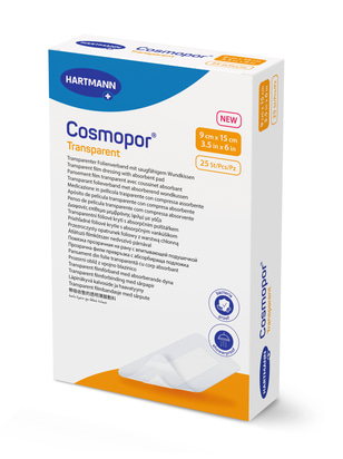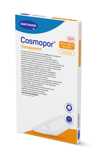 Cosmopor Transparent is a sterile, self-adhesive transparent wound dressing with an absorbent wound pad suitable for post-operative care of slightly exuding wounds, for protection against bacterial penetration and for use as a sterile dressing for minor injuries.