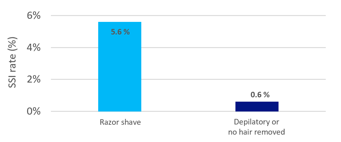 A meta-analysis comparing clipping and no hair removal vs. shaving showed aclear benefit of either no hair removal or clipping with a significant decrease oft he SSI risk.2