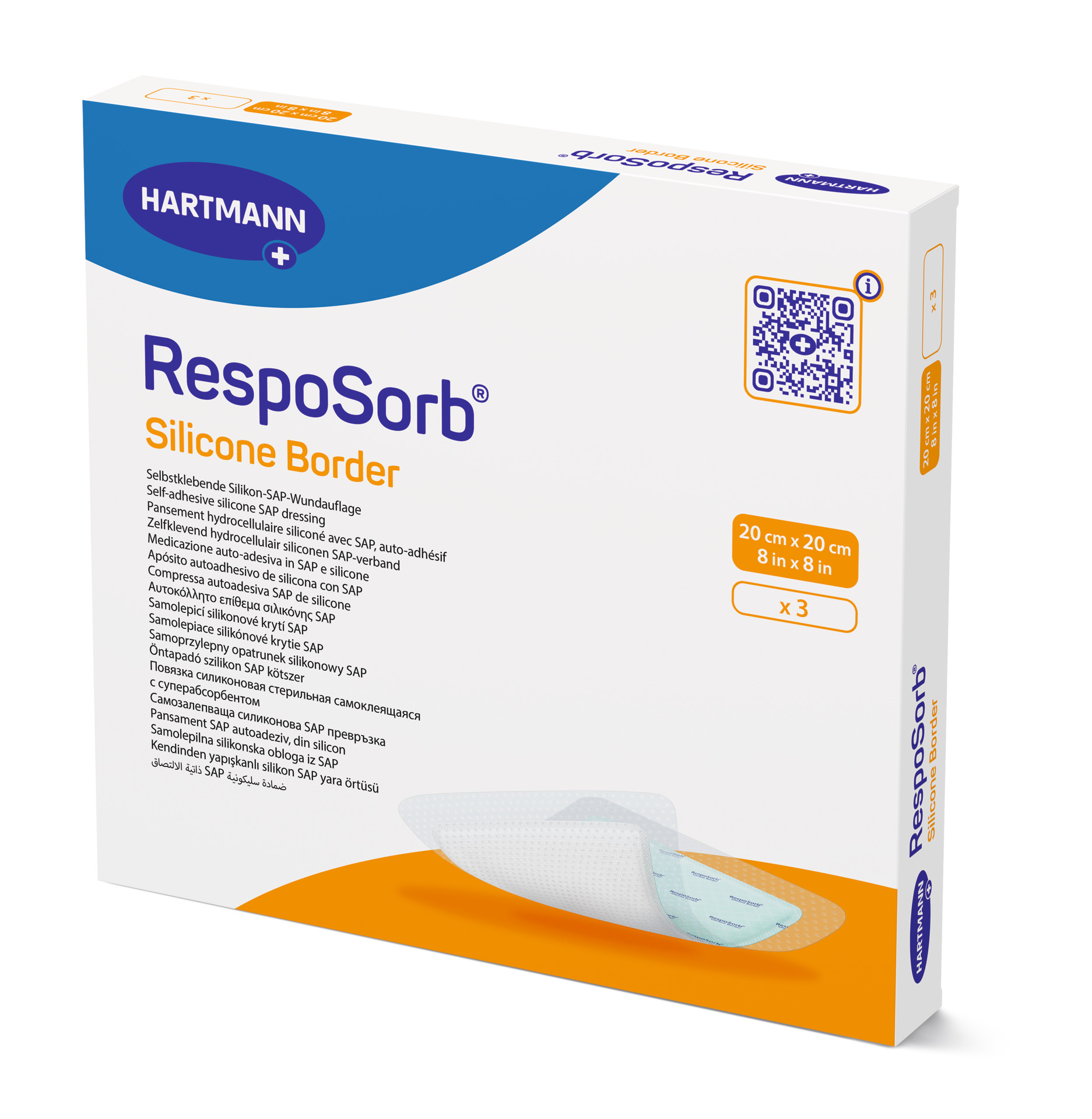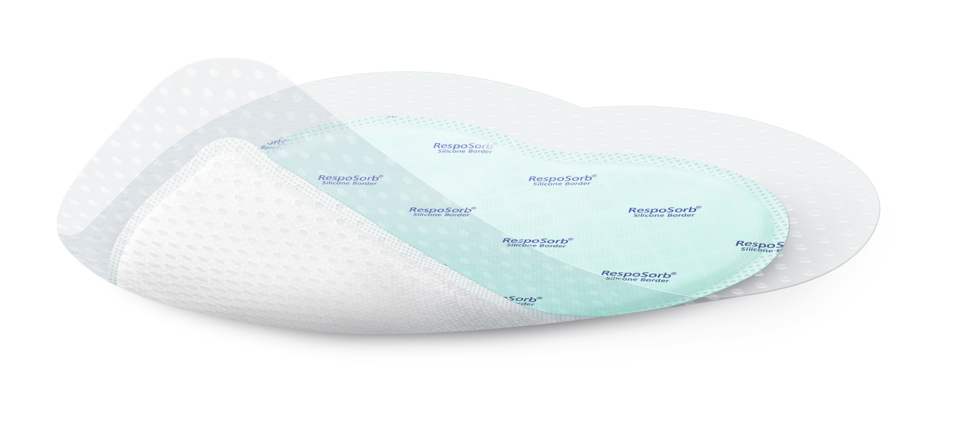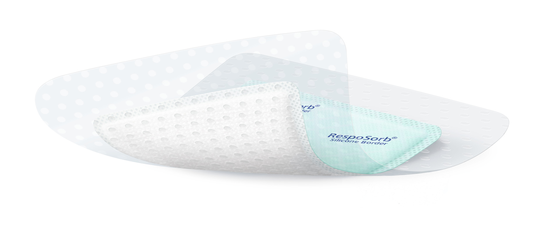 RespoSorb® Silicone Border est un pansement stérile à usage unique, auto-adhésif, à base de SAP, avec interface en silicone, pour le traitement à long terme des plaies aiguës et chroniques, avec des niveaux d'exsudat modérés à élevés.