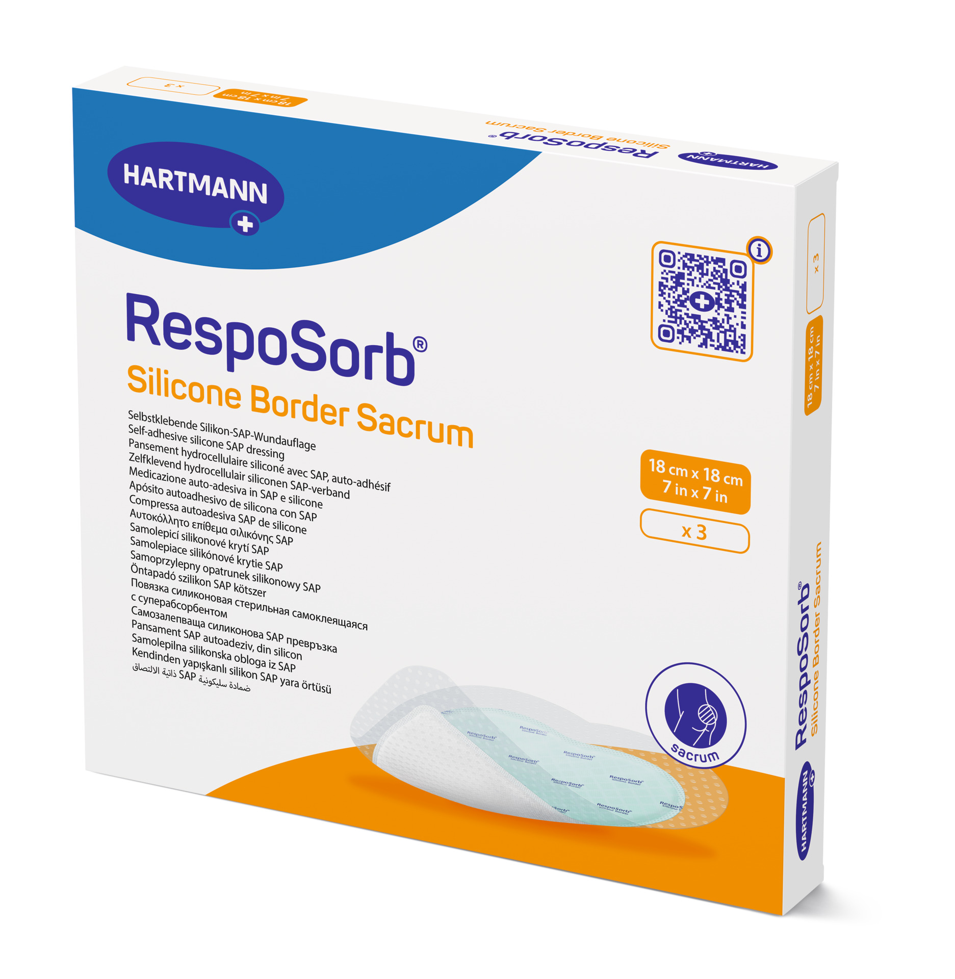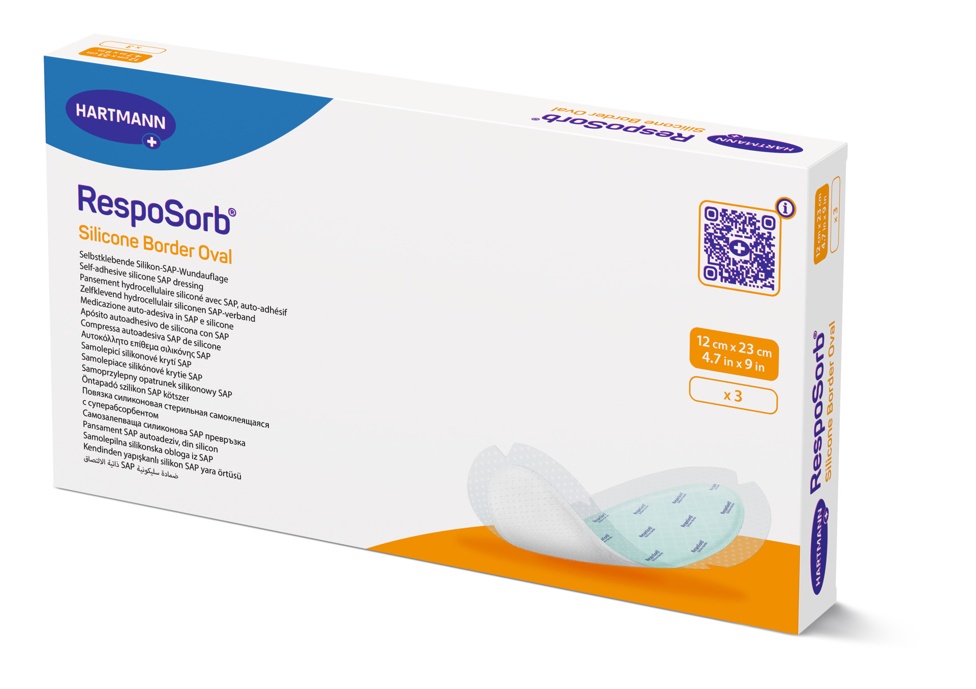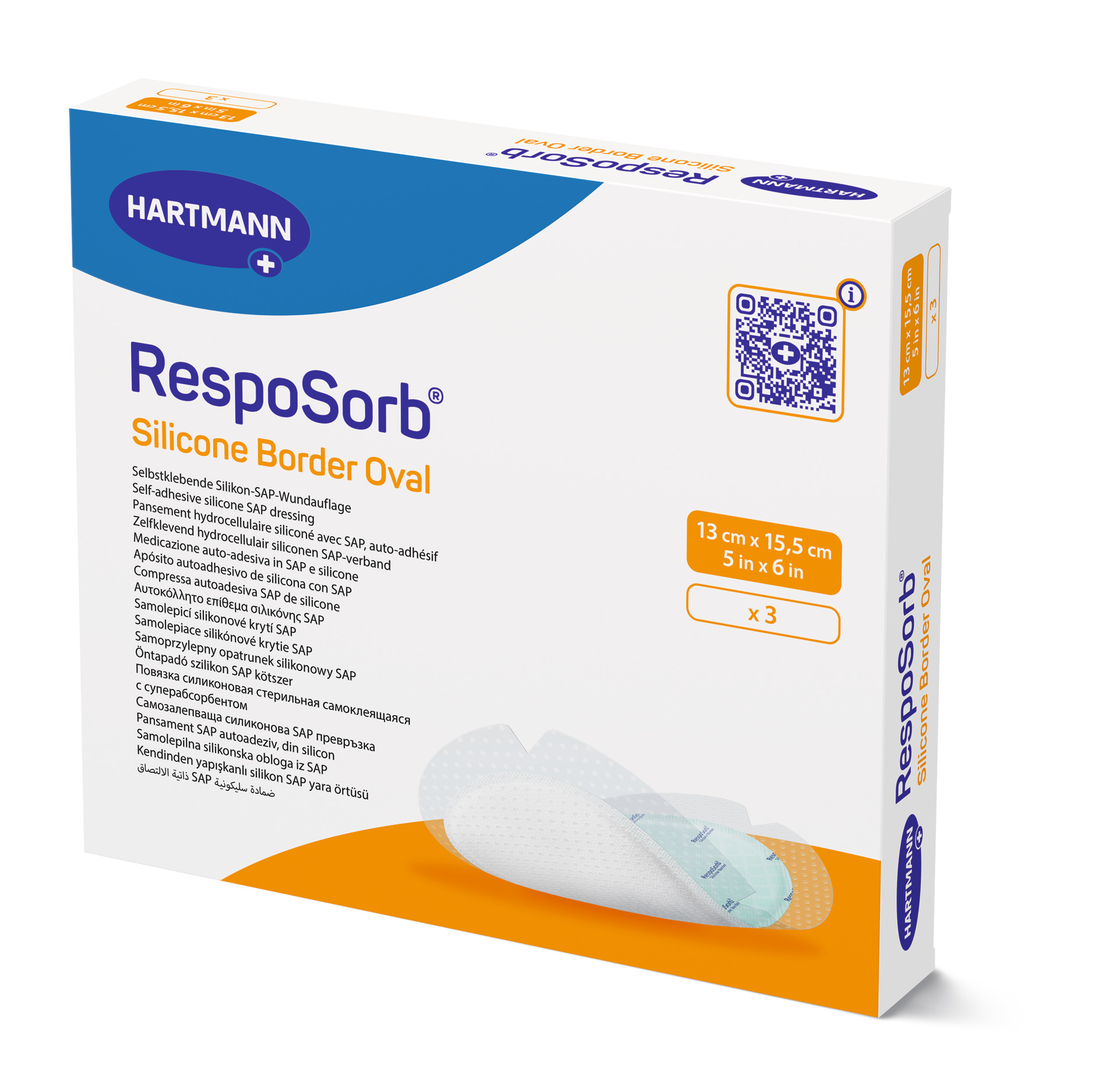 RespoSorb® Silicone Border est un pansement stérile à usage unique, auto-adhésif, à base de SAP, avec interface en silicone, pour le traitement à long terme des plaies aiguës et chroniques, avec des niveaux d'exsudat modérés à élevés.