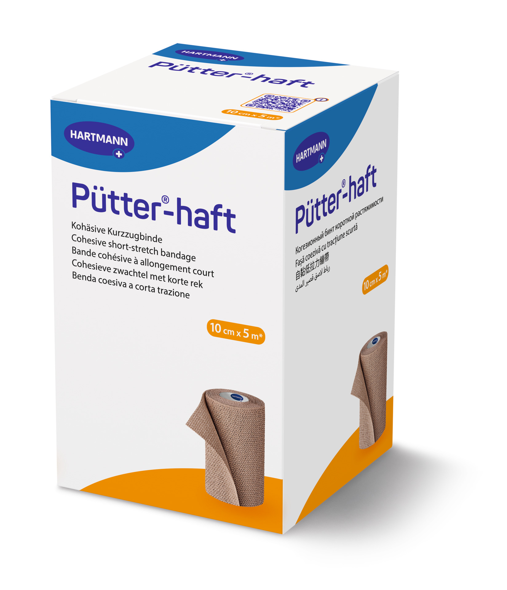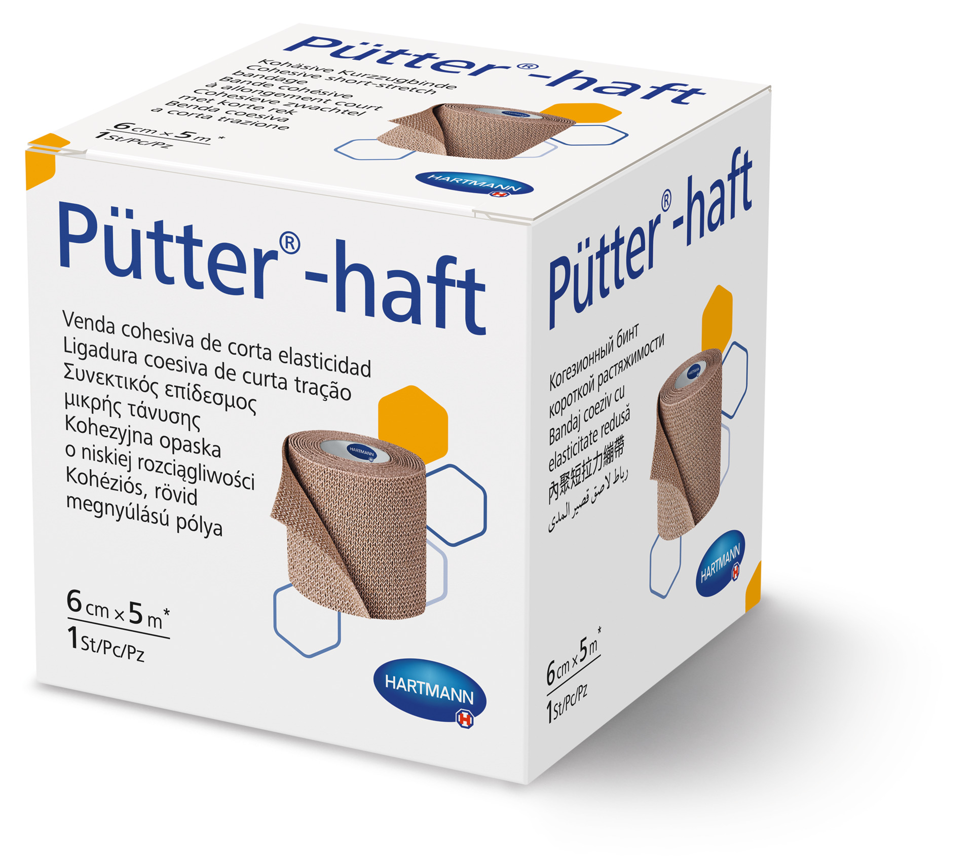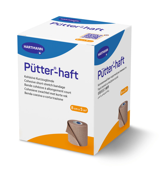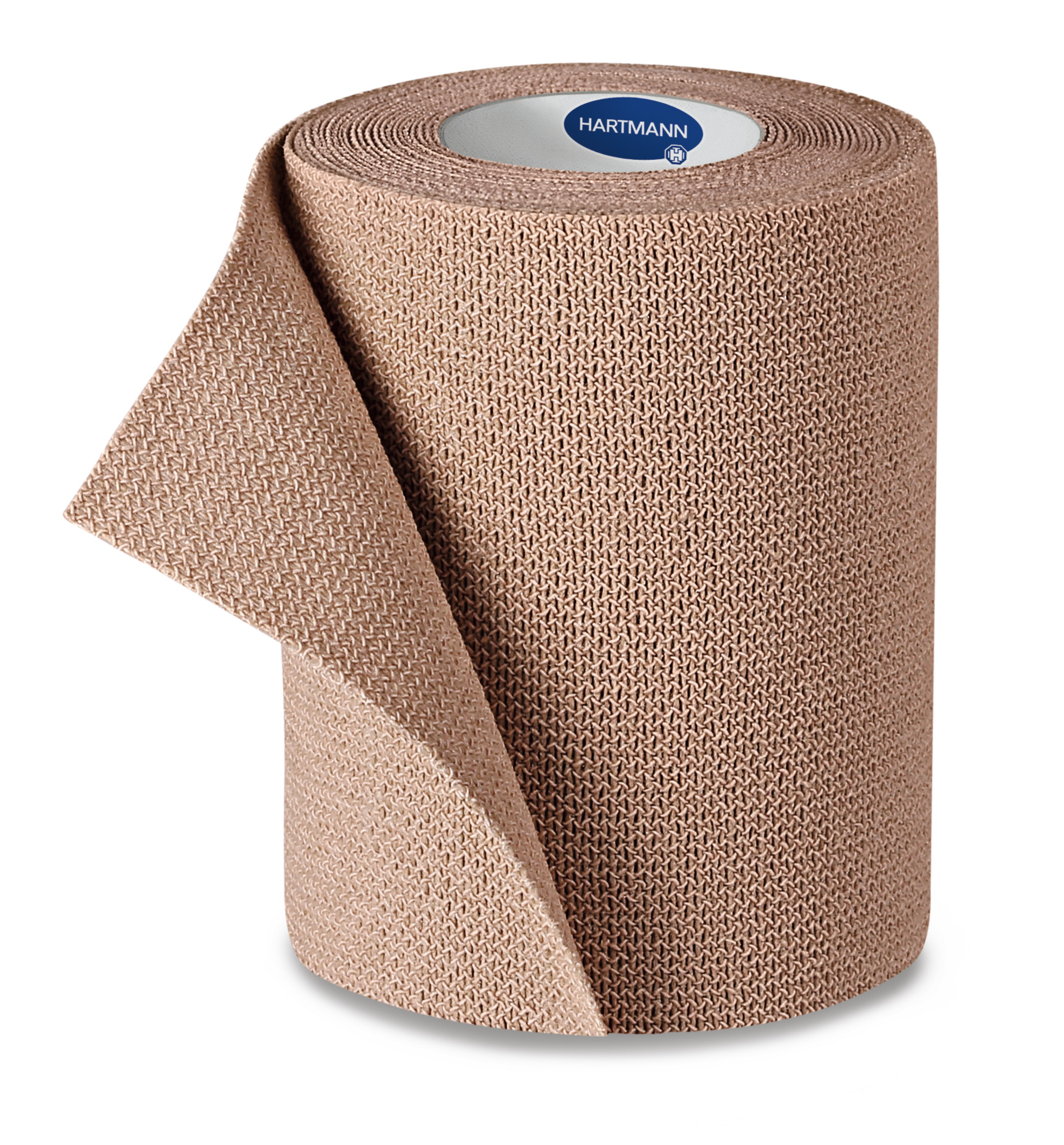 Benda coesiva a breve durata, priva di lattice, con elasticità tessile; elasticità di circa il 60%; effetto coesivo su entrambi i lati per una perfetta aderenza; pressione di lavoro molto elevata con leggera pressione a riposo; può essere indossata anche quando il paziente è in posizione di riposo; color carne. 100 % cotone, con speciale rivestimento naturale privo di lattice
