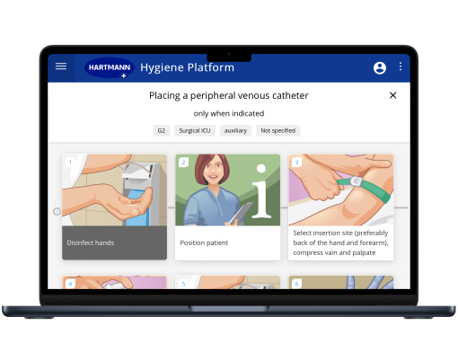 V aplikácii My Hygiene SOP je pre vás pripravených 20 preddefinovaných vzorových SOP, vyvinutých vo vývojovom centre spoločnosti HARTMANN Science Center. Tieto SOP pokrývajú širokú škálu tém, ako sú napríklad „Zavedenie PŽK“, „Odber krvi“ alebo „Výmena krytia“. Každá SOP je podrobne opísaná s vysvetlením čiastkových krokov pomocou textových popisov a ilustrácií.